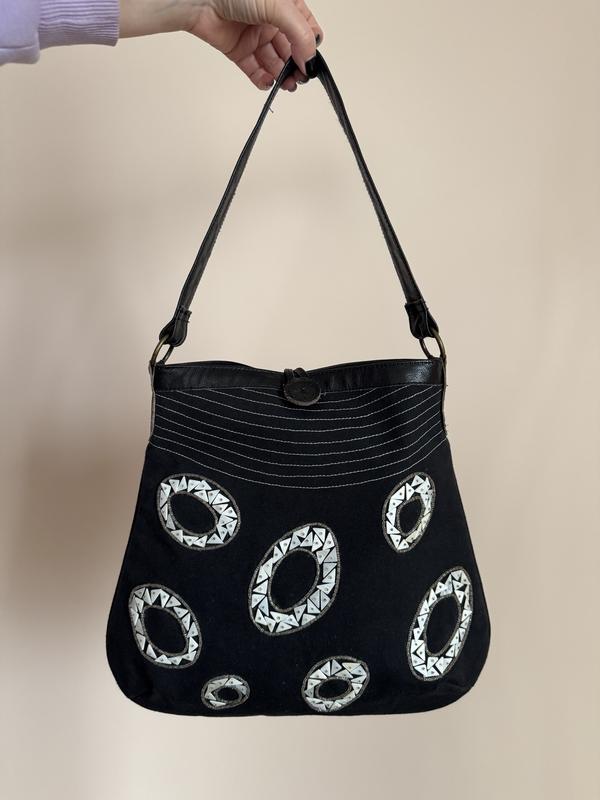 Оригінальна сумка, із шкіри та текстилю. На зовнішній поверхні є геометричний малюнок із елементами перламутру. Розмір: 33*35 см. Висота з ручками: 58 см.