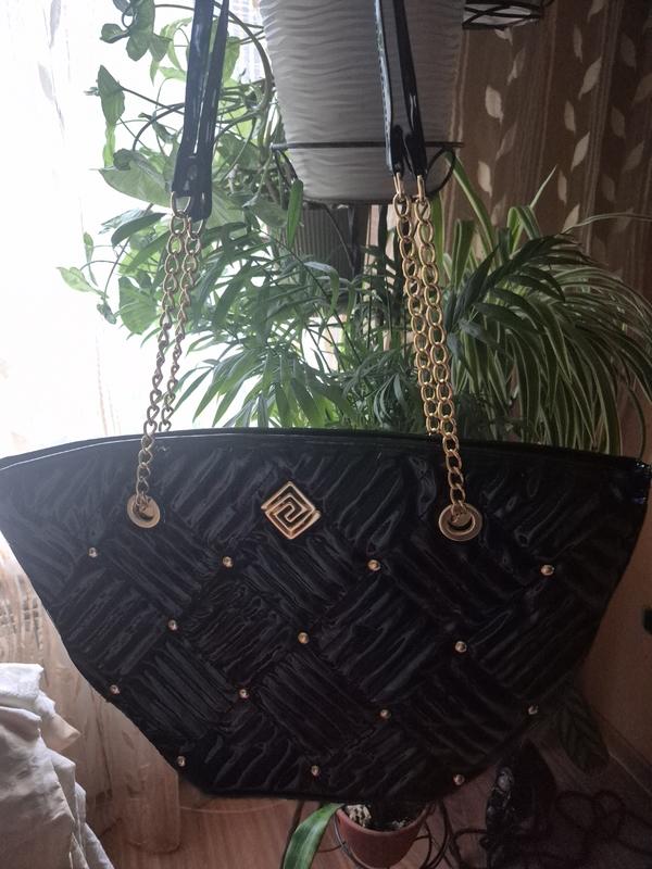 черная лакированная сумка-тоут с прошитым ромбовидным узором и золотистыми заклепками, цепочками и фурнитурой