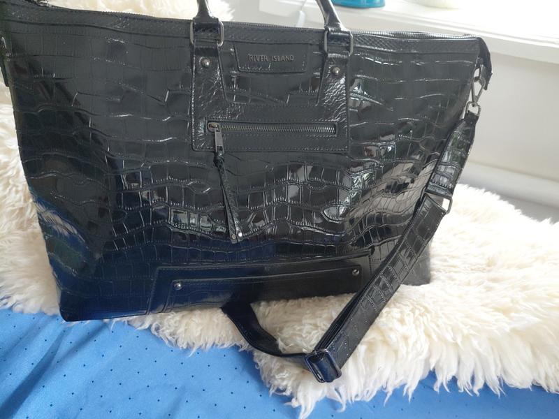 черная лакированая сумка с фактурой под крокодиловую кожу. Сумка имеет ручки и наплечный ремень, а также внешний карман на молнии. Внутренний карман на молнии. Сумка большая 60см.× 35см.× 20см