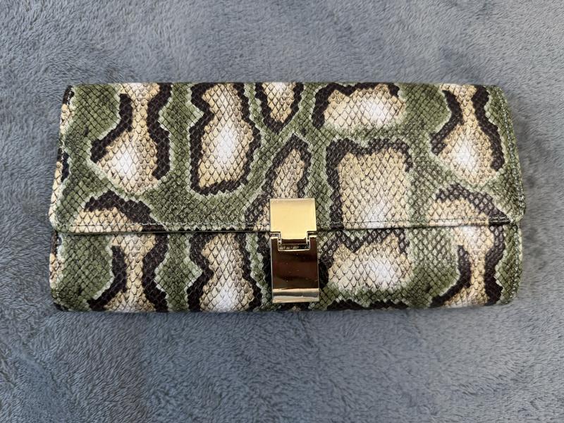 Клатч із золотою застібкою та золотим ланцюгом. Він має візерунок, що імітує шкіру змії, переважно зеленого, коричневого та бежевого кольорів. Сумочка у відмінному стані. За додатковою інформацією будь ласка звертайтесь.