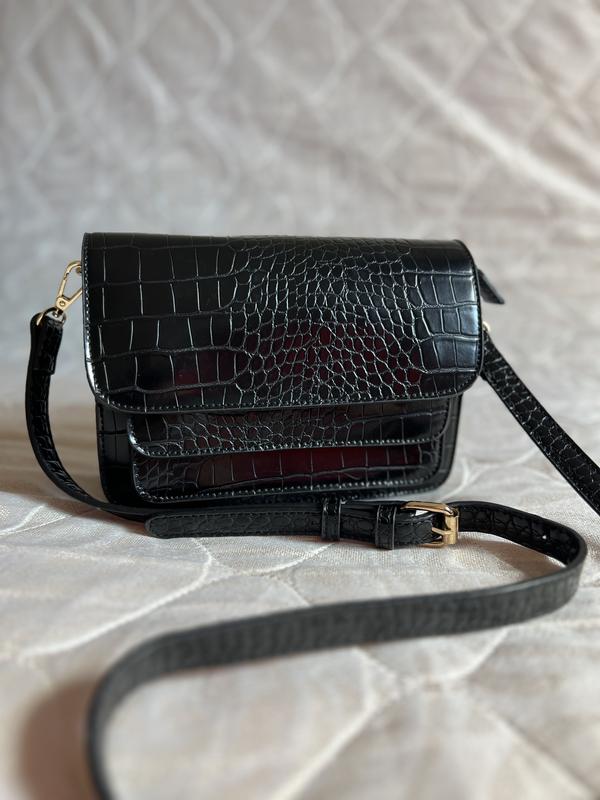 Гарненька маленька але містка сумочка. Еко-шкіра під крокодила. Має одне основне відділення та бокову окрему кішеньку. Ремінь регулюється . Сумочка в стані нової , без слідів носки. Без нюансів. Ширина 22 Висота 17 По низу 6