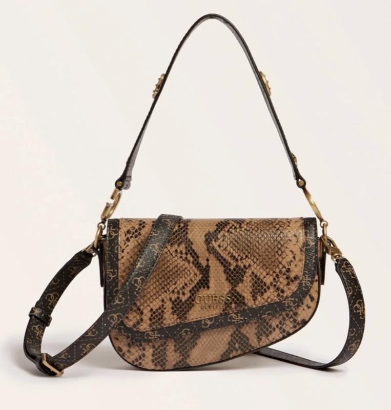 Стильна жіноча сумка від Guess з ефектом шкіри пітона. Дуже гарно поєднується як із повсякденними луками, так і з вечірніми образами. • Матеріал: екошкіра з тисненням під зміїну шкіру • Колір: коричнево-бежевий • Фурнітура: золота • Застібка: клапан на магніті • Розмір: компактний (поміщається телефон, ключі, косметика), в комплекті довгий ремінець , можна носити через плече • Стан: відмінний, практично не носилася • Логотип Guess EST 1981 спереду