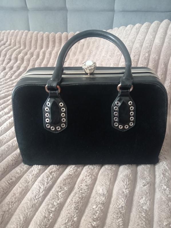 Черная женская сумочка закрывается на застежке поцелуя Впереди идет только кожа замш остальная сумочка обыкновенная кожа и посередине где сстегивается и полдз по бокам идет металлическая пластина с нейржавейки Достаточно хорошее состояние является затёртости с низа, видно на фото а так все хорошо Длина 20 см, ширина 32 см, ширина дна 16 см