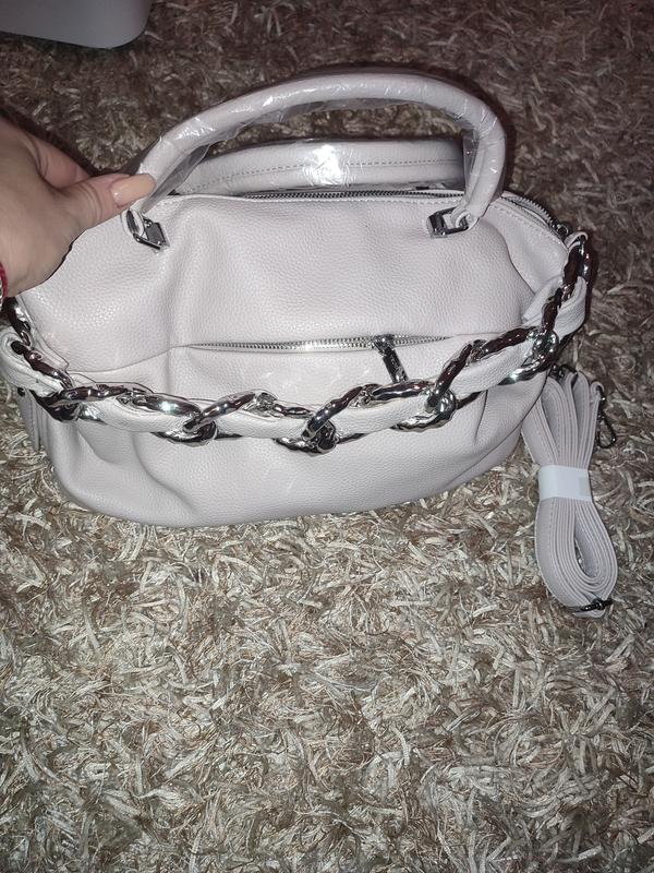 новая женская сумка бежево серый цвет. есть два отделения внутри. длинный ремешок