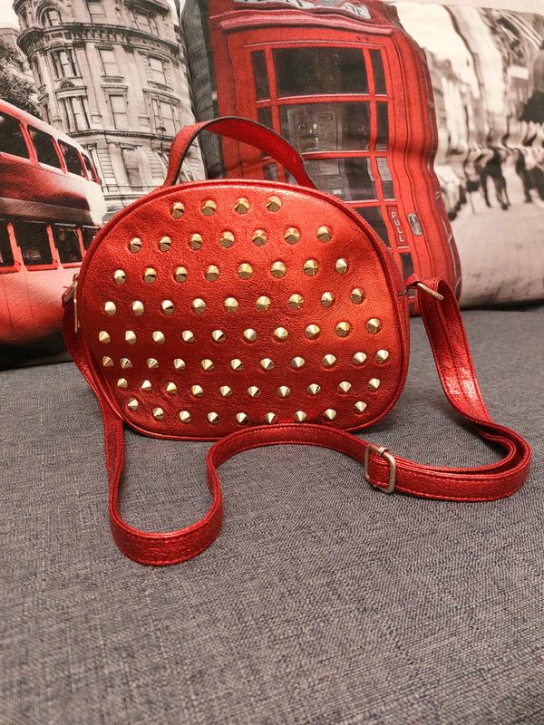 Сумочка насыщенного красного цвета, с шипами. Эко - кожа. Качественная золотистая фурнитура. Качественный плотный подклад внутри. Длинная ручка регулируется, общая длина 125 см. Внутри 2 больших отделения, 1 отделение сзади сумочки. Размеры: длина 23*18*9. Стан идеален, без дефектов.