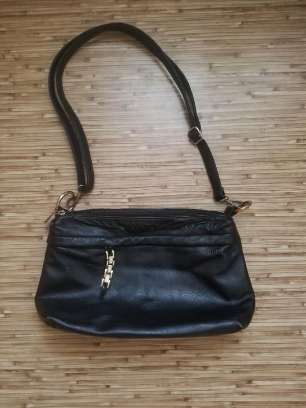 Черная женская сумка на плечо на 2 отделения из экокожи. Передняя часть имеет кармашек и заднюю часть меньше. Подкладка полностью целая. Лицевая сторона у молнии немного повреждена в результате низких температур.