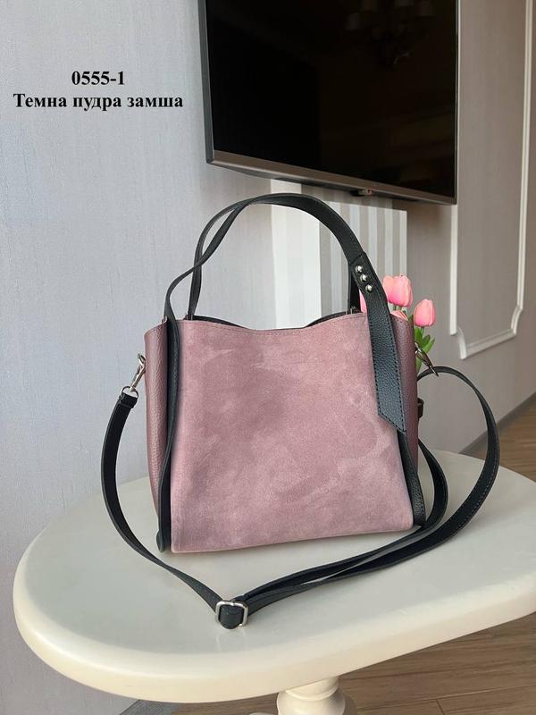 Наявність уточнюйте Елегантна сумка Кольори: чорний, пудра, шоколад Матеріал: фасад натуральна замша, штучна шкіра Розміри: 30/25/13см Три відділення. Основне середнє відділення на блискавці, усередині 2 відкриті кишені, бічна кишеня на блискавці , роздільна кишеня на блискавці. З обох боків сумки два відділення на магнітних кнопках. В комплекті знімний регульований ремінь, макс. 135 см.