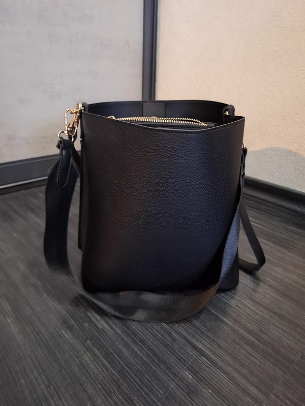 женская черная сумка размер: высота 25.5 ширина от шва до шва 38 металлическая фурнитура, просторная,вестик, по середине имеет карман на замочке, есть две шлейки( короткая, длинная)