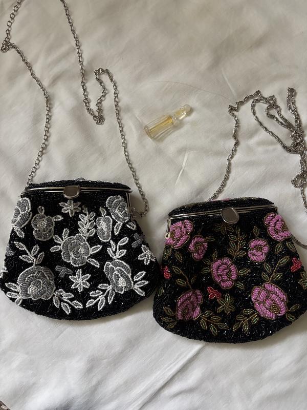 1. Лівий фермуар /сумочка: 850📮має чорну основу і вишитий бісером сірого та білого кольорів. Візерунок складається з квітів (схожих на троянди) і листя. Гаманець має металевий каркас і застібку-поцілунок (поцілункова застібка), а також тонку сріблясту ланцюжкову ручку. 2. Правий фермуар /сумочка: -950📮 також має чорну основу. Він вишитий яскравим бісером рожевого, зеленого та, можливо, червоного кольорів, також формуючи квітковий візерунок (троянди та листя). У нього також є металевий каркас і срібляста ланцюжкова ручка❣️
