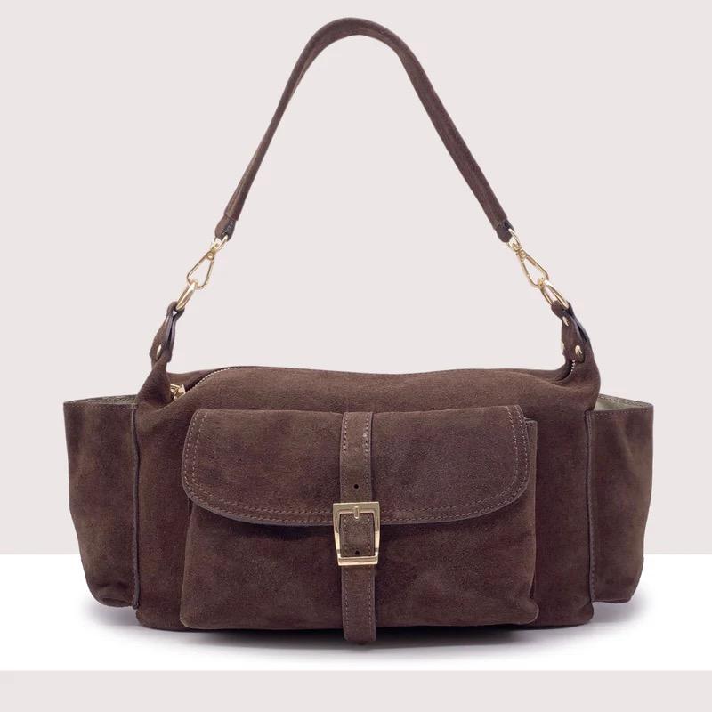 Натуральний замш , виробник Італія , довгий ремінь в комплекті , актуальний коричневий колір