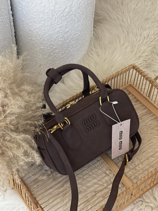 Жіноча сумка Miu Miu Arcadie Textile - Premium код кофе - 20509-2 ✅Матеріал: замша преміум якості ✅ Всередині одне відділення, також є невеличка кишеня. Всі бірки та нашивки. ✅Підкладка з щільного текстилю, є брендове металеве маркування. ✅Розмір: 23*12*8см ✅В комплекті є вузький ремінець для носіння через плече, довжина регулюється ⭐️ Коробка та пильовик в комплекті