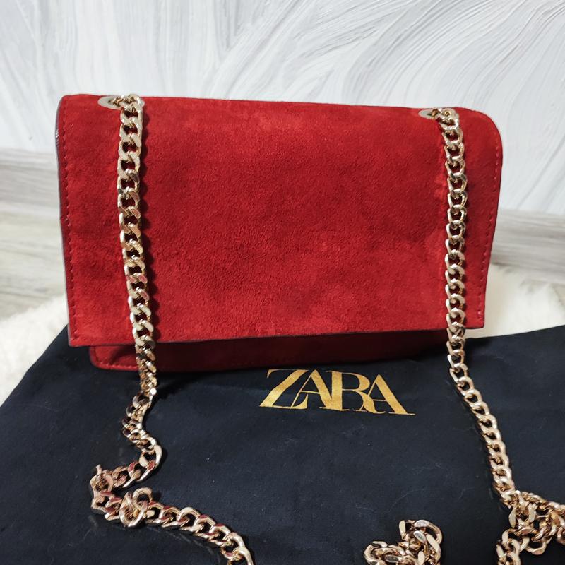 качественная сумочка на плечо ZARA из натуральной замшевой кожи в темно красного цвета ( бордовый) на фото передает ярче. В средние несколько отделений, застежка на магните. замеры: 22*18*7. Стан идеален, как новая!