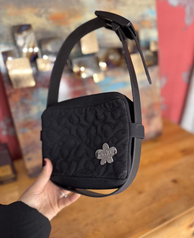 Сумка Only, черная. Материал: нейлон с стежкой. Компактная, одно основное отделение. Фурнитура серебристая, логотип-цветок. Ремень: жесткий силиконовый, регулируемый. Состояние отличное.