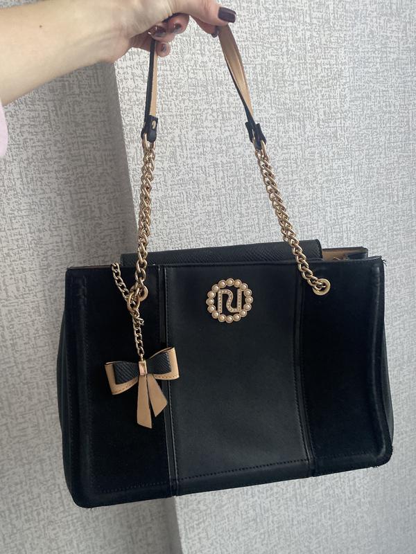 Сумка жіноча з милим аксесуаром бантиком,стан ідеальний,майже новий,носилась всього раз Не підійшла по розмірам для мене Ідеально підійде для навчання або ж роботи Всередині три відділи,один з яких на застібці посередині і також є три бокових карманчики всередині Ручки 26 см Ширина 33 см Висота 23 см
