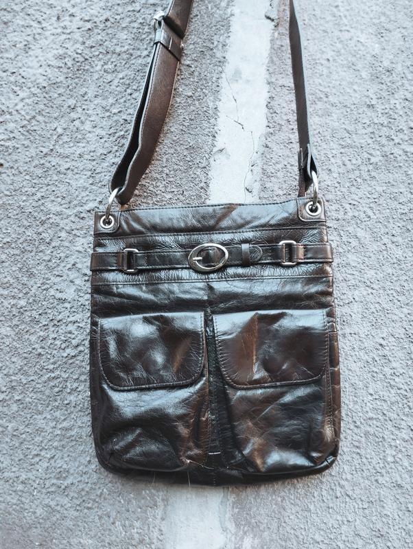 Кожаная сумка женская. Видны следы использования,в т.ч. лопнула кожа чуть миллиметров 5 (на фото). Цвет тёмно-коричневый.