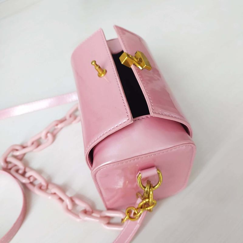 Маленькая розовая сумочка, декорированная цепочкой из пластмассы, который может служить ручкой, если хотите носить в руке. Ремешок через плечо регулируемый и съемный. Застегивается на замочек. Нова. Замеры: Высота: 14 см Ширина - 17 см Широкое денце глубиной 9 см