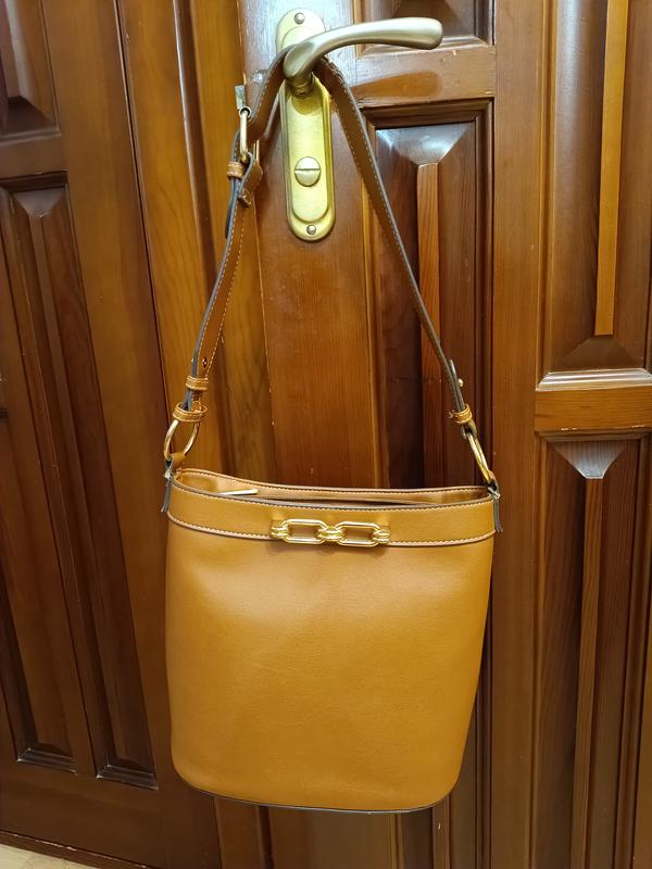 Сумка коричневая в нормальном состоянии, экокожа, размеры: высота 23 см, длина по низу 23 см, по верху 26см.
