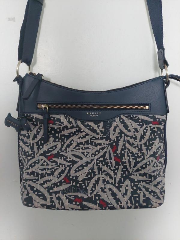 Сумка Radley темно-синего цвета с абстрактным брендированным принтом Вся фурнитура в наличии и целая. Параметры: 28/32 х 22 х 12 см