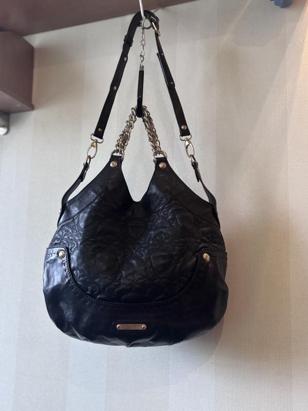 Матеріал: натуральна шкіра, вставки з масивним плетінням металевих ланцюгів • Колір: чорний • Фурнітура: металева з гравіюванням Versace • Усередині: замшеве підкладення, є природні потертості від використання • Стан: зовні – відмінний, всередині – сліди носіння Сумка виглядає дуже стильно та рідко зустрічається у продажу.
