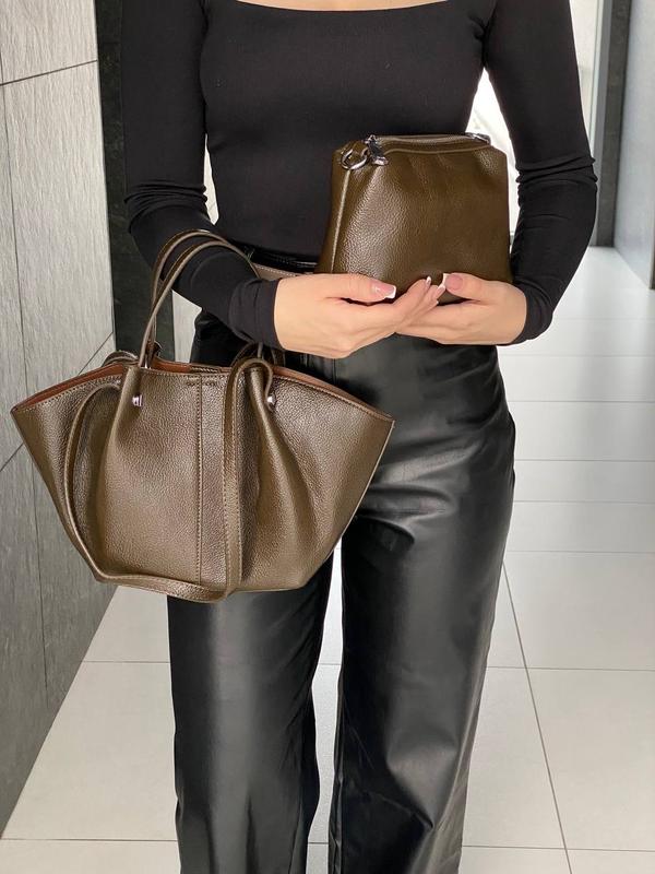 Сумка жіноча 2 в 1 Три кольори в наявності чорна, коричнева, оливка Складається з шоперу на магнітній кнопці, та сумочки -косметички яку можна носити в середині шоперу, або як окрему сумочку кросбоді через плече Арт 89979# Розміри шопер висота 23 см, ширина зверху 35 см , дно 21*9 см , довгі ручки висота 30 см Кросбоді розмір 14*19*5 см на блискавці, є підкладка