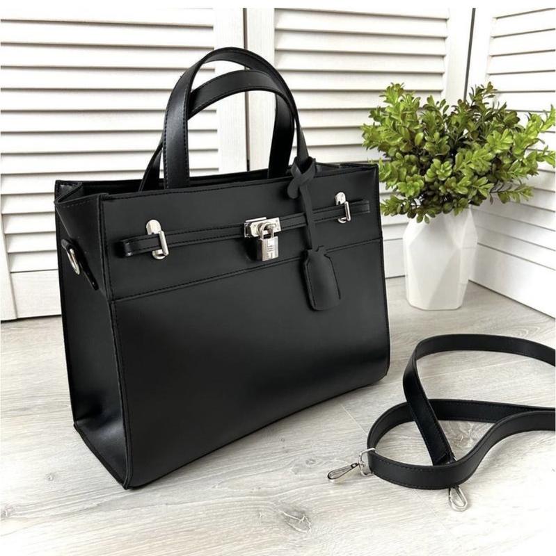 Чорна сумка для жінок Розміри: Висота - 25 см. Ширина - 32 см. Дно - 13 см. Довгий регульований ремінець. Матеріал - екологічна шкіра. Сумка має два відділення, між ними відділення на блискавці. Дві кишені відкриті та одна на блискавці.