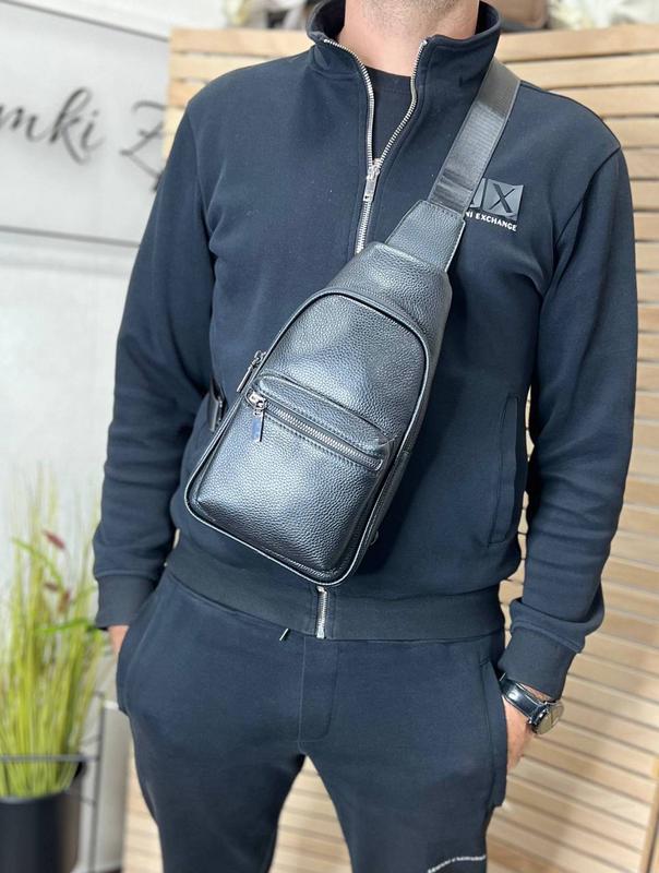 Мужская качественная и стильная сумка слинг из натуральной кожи черная