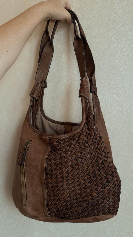 Кожаная, вместительная, выполненная с плетеными элементами, имеет винтажный стиль
