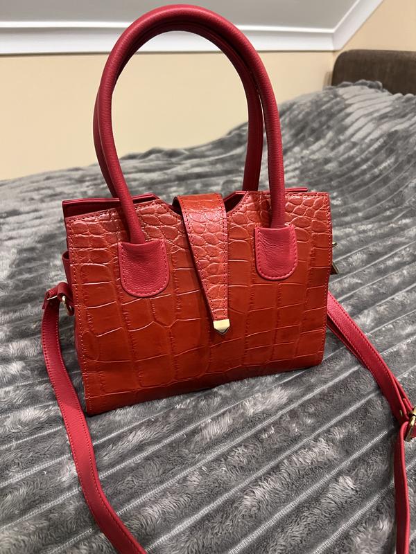 Дуже гарна та стильна сумочка! Виготовлена з штучної шкіри, з переду тиснення під крокодила. Має одне відділення, в якому є кішенькові на змійці та дві невеличкі кишені. Все що потрібно жінці поміститься в цій шикарній сумочці. Як що рука на повна то можна носити і на плечі Без нюансів. Майже як нова. Ширина 24 Висота 17/21 По низу 9.5 х 24 Висота ручок 13 см