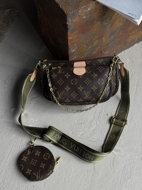 🩷🩷🩷🩷🩷🩷🩷 Сумочка 3 в 1 Louis Vuitton Multi Pochette bag Код корич.+коричневий 20428-1 корич.+рожевий 20428-2 корич.+зелений 20428-3 Виготовлена з високоякісної екошкіри та знаменитим монограмом LV. Сумочка має якісні карабіни. Пошиття строчечка до строчечки. Сумочка трансформер, складається з двух сумочок великого та меньшого розміру. В комплекті монетниця . Має в середині нашитий логотип та бірки. Фурнітура метал, колір золото. Ніжний на дотик ремінець з монограмом LV. Розмір великої сумочки - 23*12*5см Розмір маленької сумочки -19*11*4см Довжина широкого ременя - 126см Довжина цепочки - 53см ⭐️ Пильовик в комплекті ⭐️1550грн