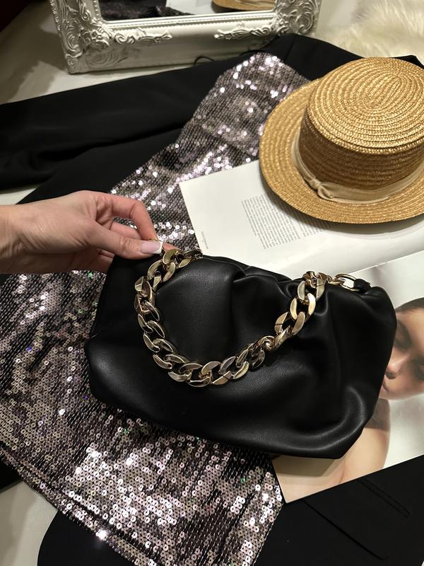 Гарна чорна сумочка на золотому товстому ланцюжку Виконана з еко-шкіри (мʼякенька) Стан ідеал,єдиний нюанс кнопка погано закріплена і при відкриванні вона злітає( потрібно в майстерні просто добре затиснути ) + є замок