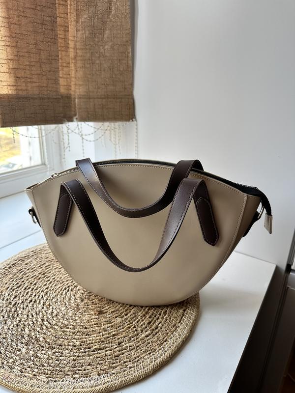 Продам стильну бежеву сумку без бренду. Модель має зручну напівкруглу форму та темно-коричневі ручки, виглядає мінімалістично й пасує під будь-який одяг. Матеріал щільний, Можу відправити додаткові фото