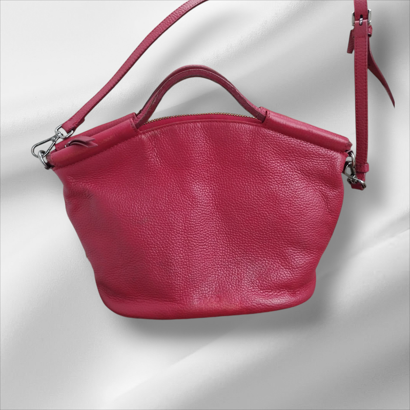 Кожаная сумка со следами использования. Есть потёртости на углах,темные пятнышки на дне, облупилось покрытие кромки кожи на ручках. Замеры на фото.