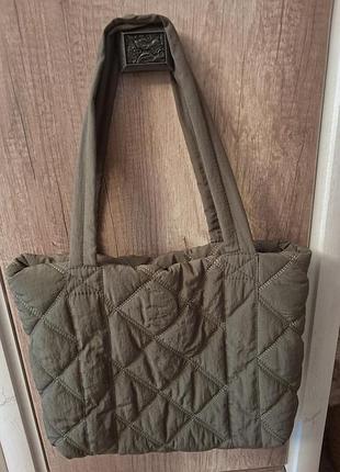 Ошатна, легка, мякенька сумка кольору хакі. Верх з плащової тканини, все охайно прошито. Всередині одне відділення, три кишені. Висота 35, ширина 43, довжина ручок 63