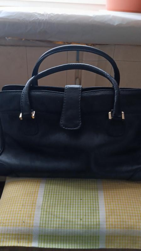 Сумка кожаная, в середине также кожа, имеет 4 отделения и плюс кармашек сбоку на застежке, высота сумочки 24 см, ширина 34 см, объем (вместимость) 14 см. Имеет недостаток, одна сторона ручки ззади закручивается на винтику, недостаток не виден, ручка хорошо держится.