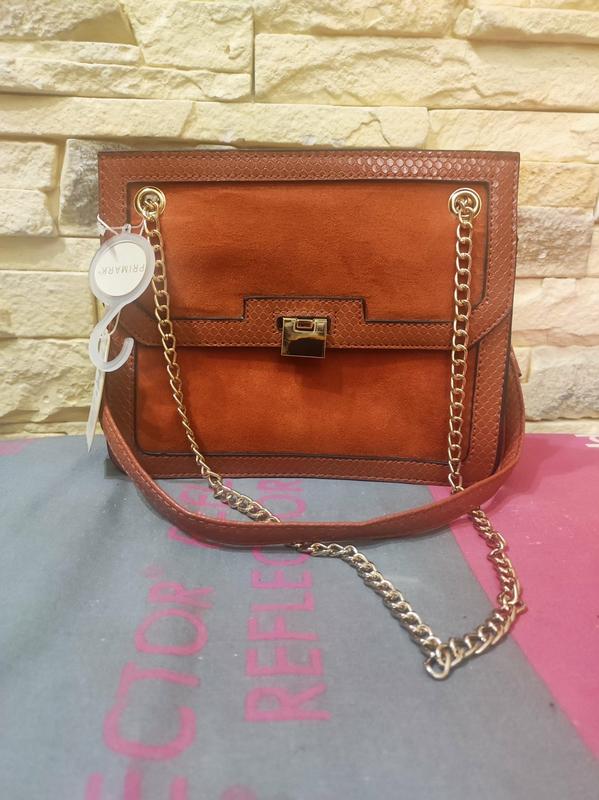 Сумка-кросбоді відомого бренду Primark , нова,гарного теракотового кольору, одне відділення,заміри: ширина 22 см,+ бокові стінки 3-4 см, висота 18 см, довжина регульованого ремінця 114 см,ширина дна 5 см.