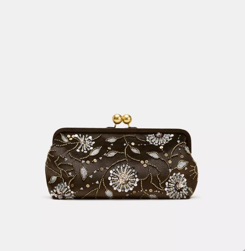 Блестящие аппликации и пайетки. Внутренний карман на молнии. Застежка на металлическую клипсу. Высота x ширина x глубина: 14 x 17 x 7 см
