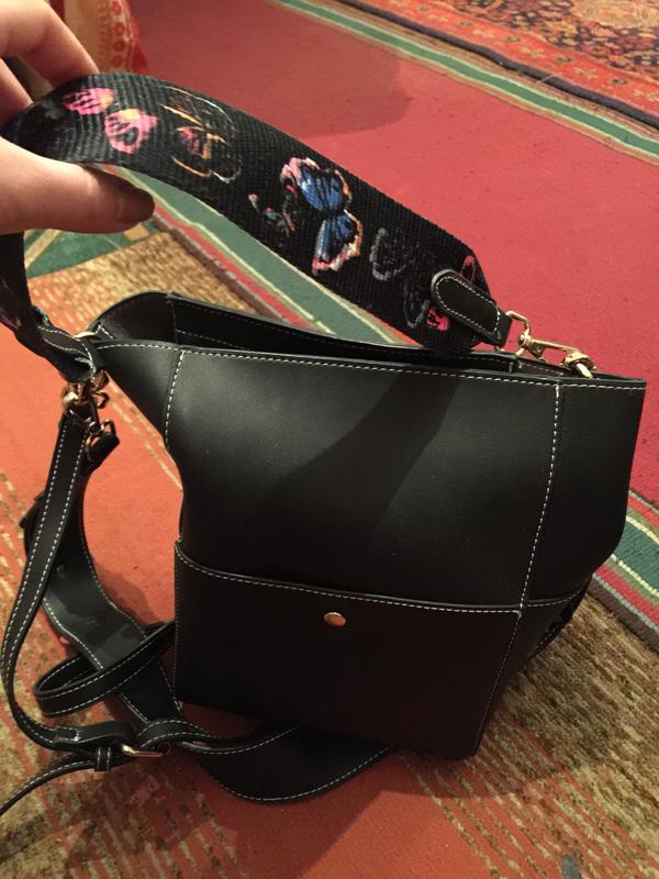 Яркая и очень вместительная сумка. 2 боковых отделения,2 отделения спереди и сзади,внутрь крепится маленькая сумка-косметичка для мелких вещей,можно также носить без неё. В комплекте 3 ручки: обыкновенная длинная тонкая, ручка средней длины {на плечо} с цветами и ручка маленькая, чтобы носить на сгибе руки с вышитыми бабочками. Можно снимать и одевать все одновременно или по очереди,как удобно. Состояние идеальное,никаких потёртостей совершенно,дно чистое. Маленькая сумочка внутри также имеет 1 отделение на молнии и отделение для помады,телефона. Внутри также без рваных дыр. Качество очень хорошее.
