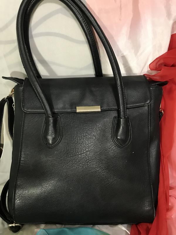 Чорна сумка. Дуже вмістка через те, що висока і має по бокам замочки які також ширять сумку. Є дві ручки і довгий ремішок. Всередині три відділення. Висота 32см, довжина 30 см. Матеріал поліестер. Є пару недоліків - потертості внизу на швах. Можливий торг.