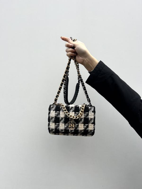 Це Chanel Classic Flap Bag (класична флап-сумка), але не в шкірі — а в матеріалі tweed / boucle з фірмовим візерунком у стилі “checkered tweed”. Матеріал: • Твід (tweed / boucle) • Комбінація чорного, білого та кремового • Фурнітура — золото (Gold Hardware) Особливості: • Класична подовжена форма • Ланцюжок через плече зі шкіряним плетінням • Логотип CC — золотий, об’ємний • Внутрішнє оформлення — чорна шкіра • Стандартний внутрішній клапан, як у Classic Flap ⸻ 🗓 Рік виробництва за серійним кодом Код 27XXXXXX відповідає виробництву: 2019 – 2020 рік Це період, коли Chanel активно випускала сезонні варіанти Classic Flap у різних твідових патернах. ⸻ ⭐ Що це за лінійка? Це Seasonal Tweed Classic Flap — сезонна, обмежена серія, яка виходила невеликими партіями. Такі моделі коштували навіть дорожче деяких шкіряних через рідкість та ручне виготовлення твідових тканин.
