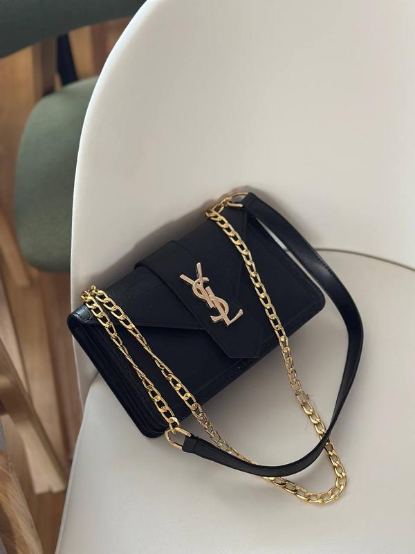 Колір: Чорний. Матеріал: Якісна екошкіра (тиснення під крокодила). Фурнітура: Золотиста, логотип у стилі YSL. Ремінець: Комбінований – ланцюжок + екошкіра. 📏 Розміри: Ширина: 23 см Висота: 14 см
