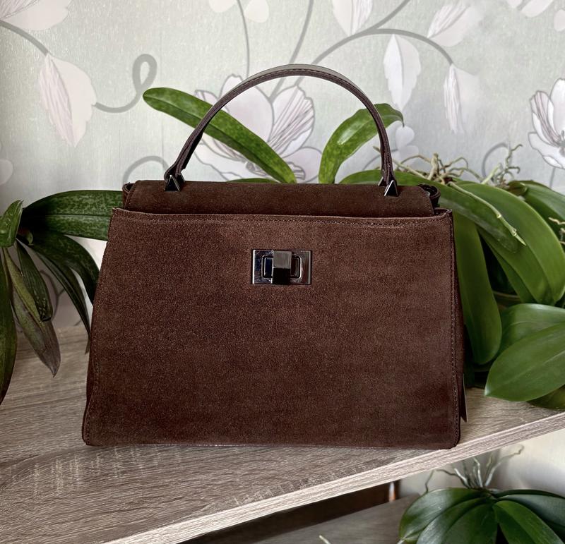 Сумочки українською бренду Valetta collection. Нові, з біркою. Натуральна замша. Коричнева. Новинка! Великий формат. Коричнева натуральна замша. Два відділи, кишеня на змійці та без змійки, довгий ремінець. Розмір - 26,5*19*12 см. Ціна - 1350 грн.