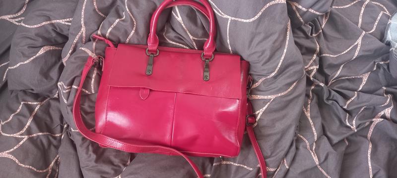 Сумка кожаная красного цвета, очень вместительная, есть пара незначительных чёрных помарок на фото видно. Новая, 1 раз носилась.