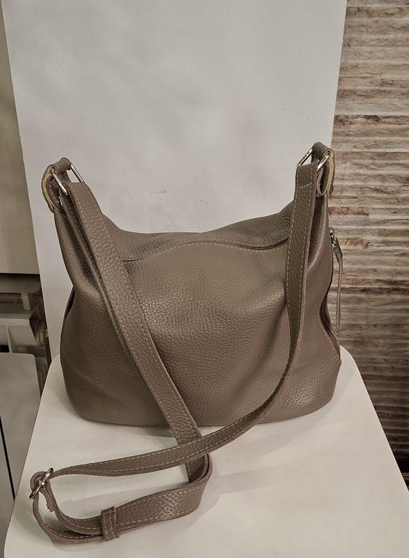 сумка из натуральной мягкой зернистой кожи бежевого цвета на одном регулируемом ремешке. закрывается на молнию, имеет три отделения, центральное на молнии. По бокам боковые карманчики на молниях и с оборотной стороны еще карман на молнии. Размер высота 23см,ширина 32см,дно 25 на 12см. максимальная длина ремешка 135см,ширина 2см.