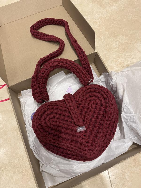 Вʼязана сумка у формі серця ❤️ Стильний і незвичайний аксесуар, виконаний вручну. ▫️ Колір: бордовий ▫️ Матеріал: щільна пряжа, добре тримає форму ▫️ Стан: нова ▫️ Довгий ремінець — зручно носити через плече ▫️ Закривається щільно, тримає форму Ідеально підійде для прогулянок, фотосесій, побачень або як акцент до базового образу. Чудовий варіант на подарунок 💝 Розміри- 23/30