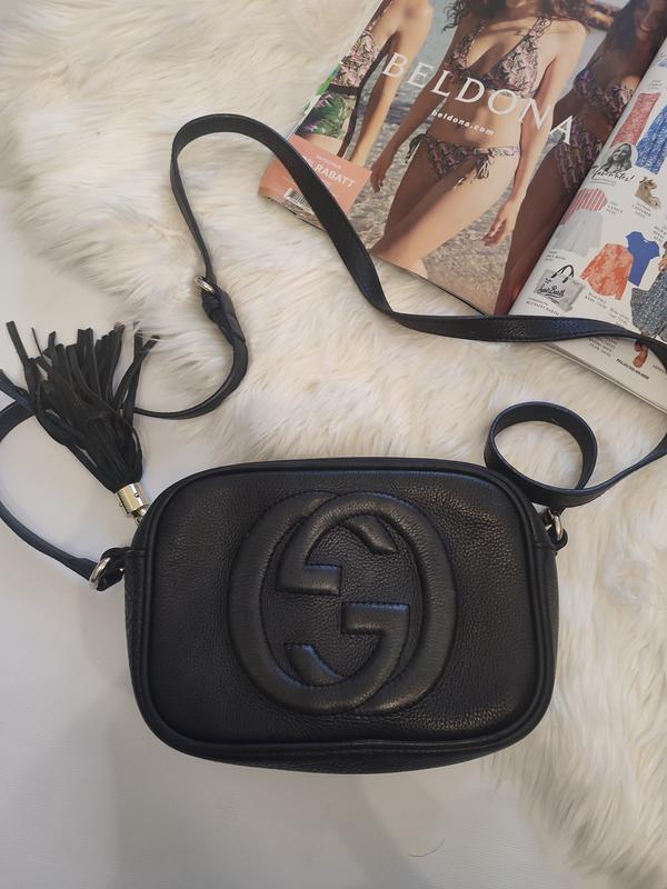 Кожаная сумка Gucci Soho 16*22*7 см ремень регулируется 145см. Один основной отдел на молнии, внутри два кармашка. Фурнитура золотая. Слоды использования смотрятся на фото. Стан хороший, трiщинки на ремiнцях ( останнi два фото).