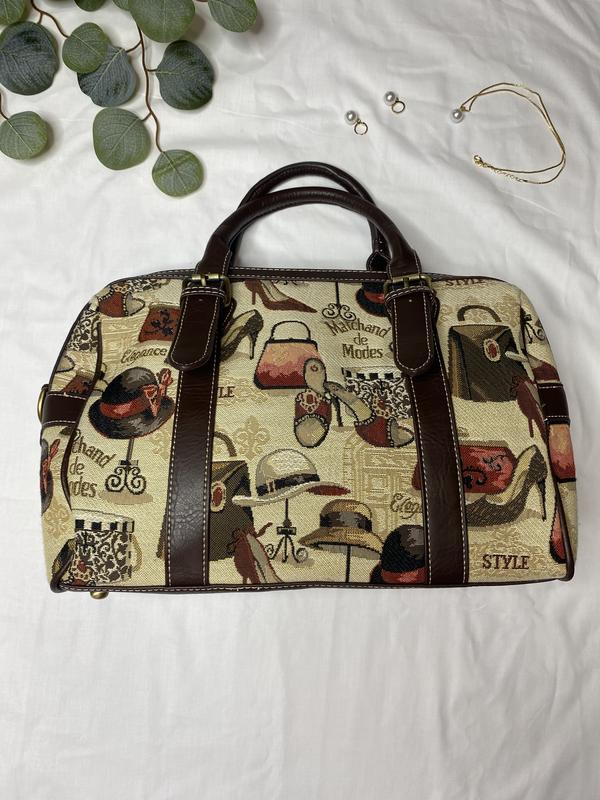 Сумка-саквояж від бренду Signare Вона має гобеленовий дизайн із принтом ,що зображує різні модні аксесуари. Матеріал виготовлення-текстиль із вставками натуральної шкіри Довжина-31 Висота-23 Ширина-12(знизу)