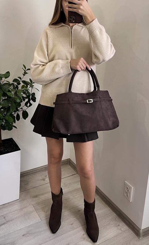 Новенька стильна, шоколадного кольору вмістка сумка під замш, розкладається і тримає форму. Розмір 42•24•14