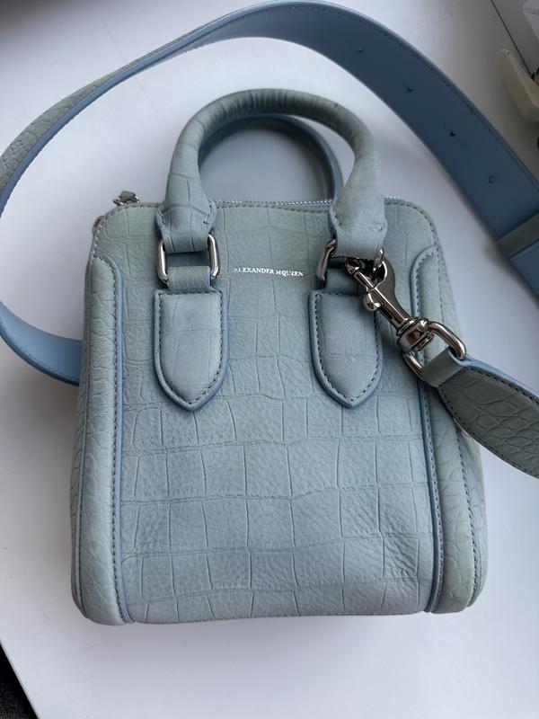 Alexander McQueen Heroine Mini bag Оригінал. Кроко-тиснена теляча шкіра, світло-блакитний / dusty blue колір, срібна фурнітура. Стан: відмінний, мінімальні сліди дуже бережного носіння, подряпин немає, форма ідеально тримається, шкіра «жива». Носилася дуже рідко. У комплекті оригінальний чохол. Коштувала 1700 дол