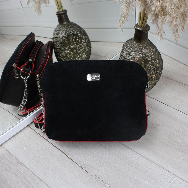 Женская стильная и качественная сумка из натуральной замши и эко кожи черная с красным