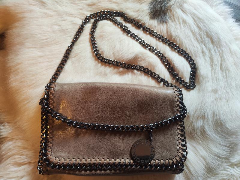 Сумка Stella McCartney модельFalabella. Сумка окантована периметром і має ручку-ремінь як темний металевий ланцюжок. Також є металевий медальйон із логотипом бренда. Підкладка прикрашена фірмовим логотипом бренда. Сумка закривається на магнітну клямку. Сумка в чудовому стані